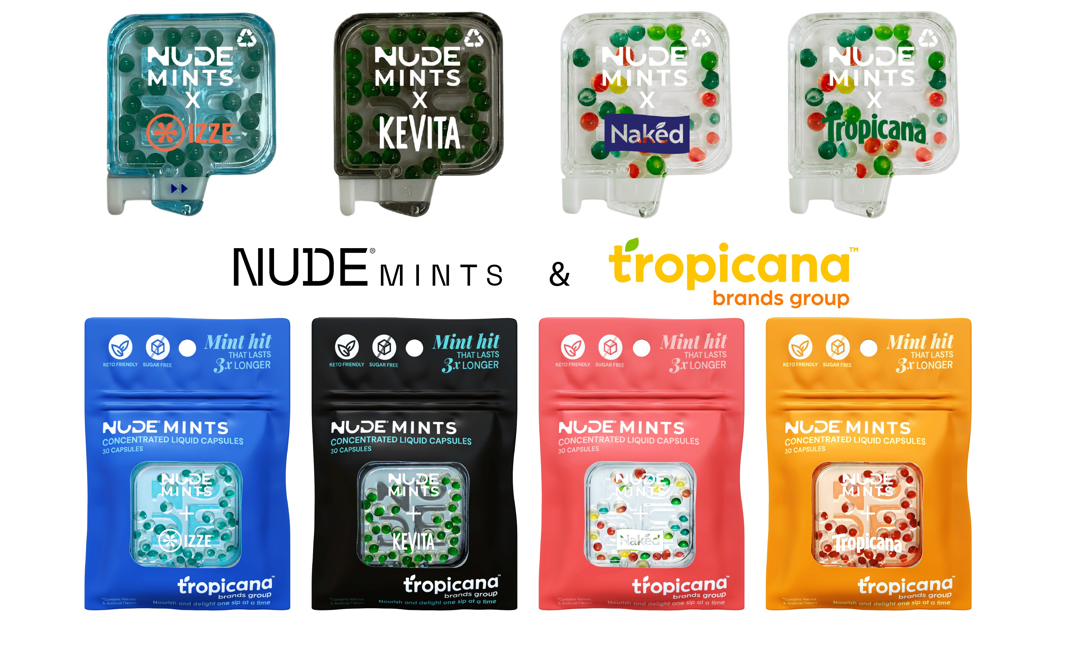 NUDE Mints was selected as a brand partner by Tropicana Brands Group — one of the world's most recognized names in beverages - for a limited-edition co-branded collaboration. The partnership required developing custom branded packaging that aligned three NUDE Mints flavors with three of Tropicana's flagship brands: Tropicana, Naked, and Kevita & Izzy.