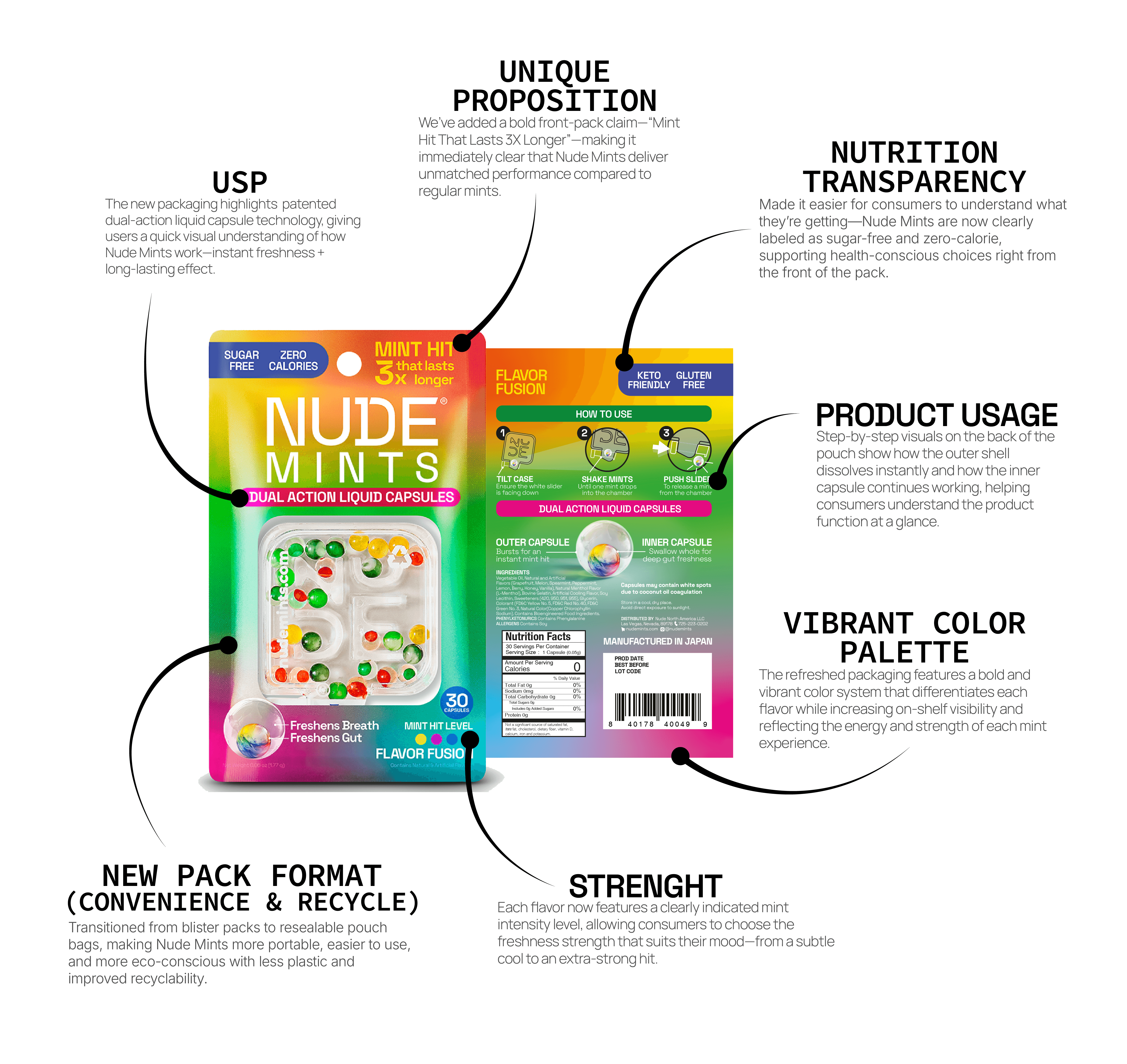 The redesigned packaging communicates the "dual-action " system - instant outer-shell activation in 3 seconds, sustained inner-capsule freshness - clearly at point of sale. The hierarchy was restructured so that a consumer encountering NUDE Mints for the first time could understand the core value proposition without reading the back of the pack.